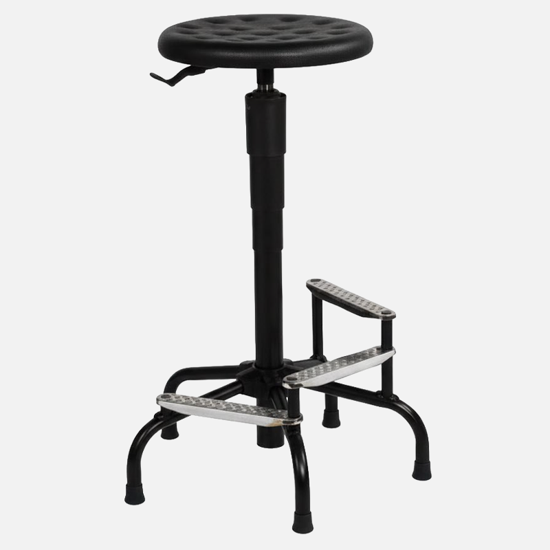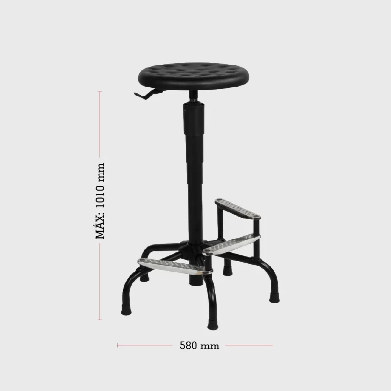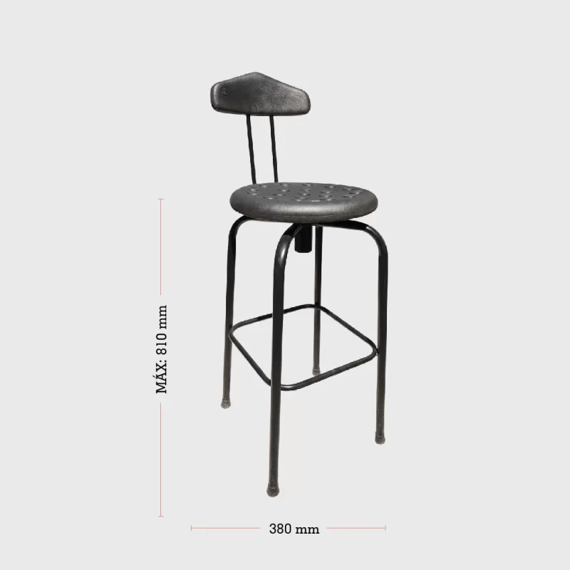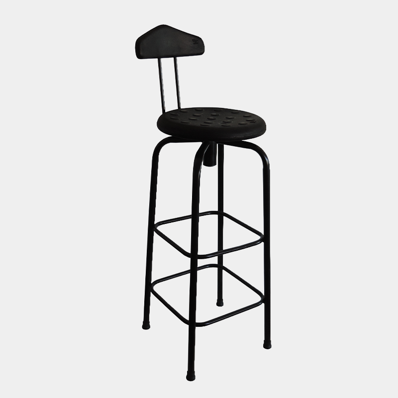 Taburete alto de uso industrial. Cuenta con respaldo (opcional), asiento redondo giratorio, apoya pie y regulación de altura.