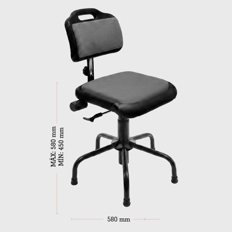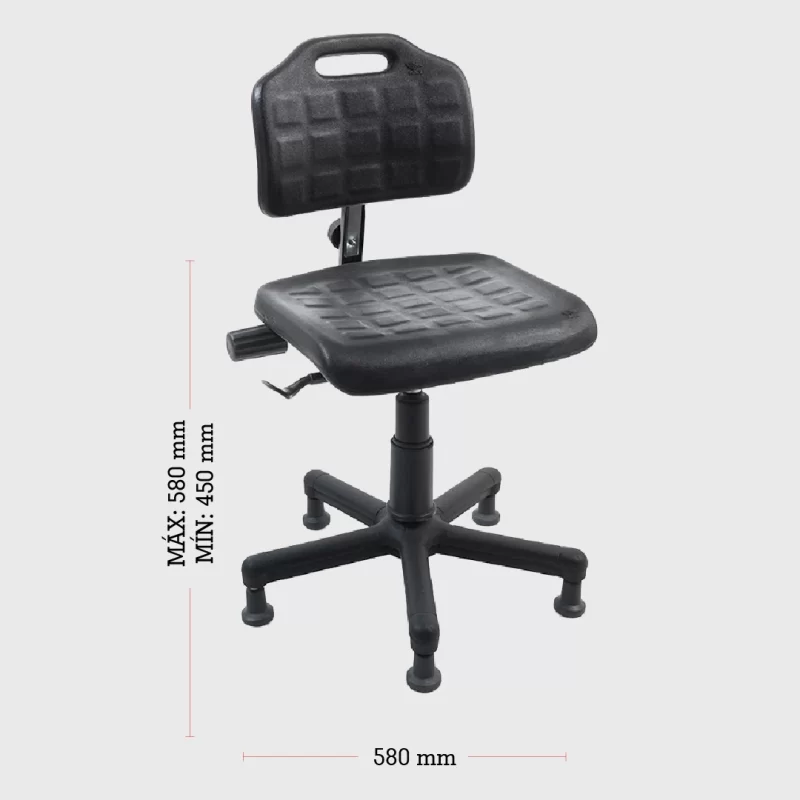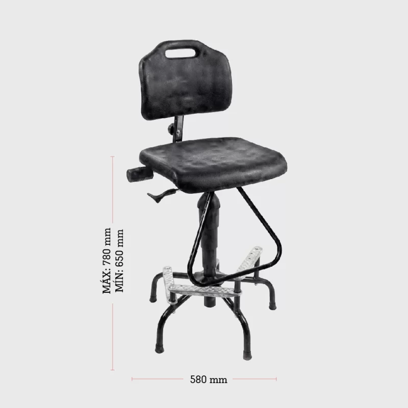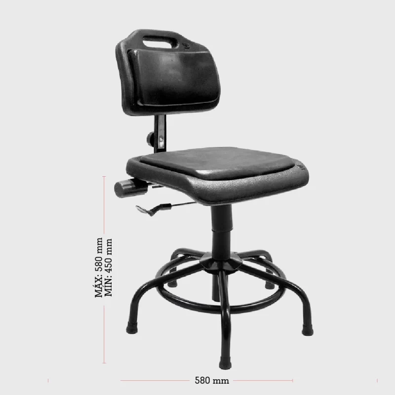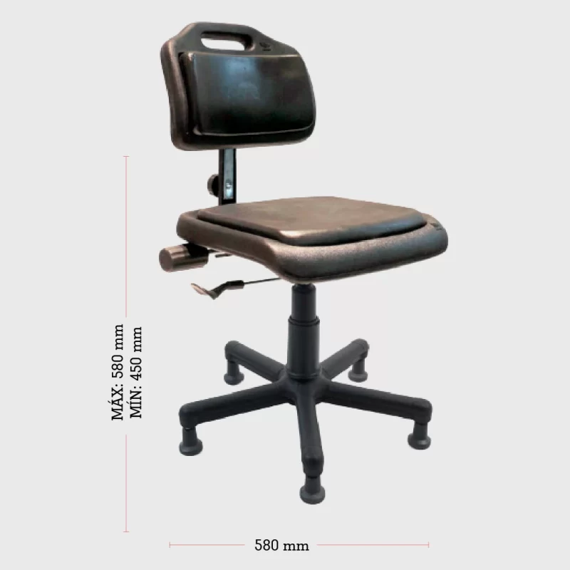 Silla ergonómica de uso industrial. Cuenta con respaldo fijo o reclinable, asiento cuadrado giratorio y regulación neumática de altura.