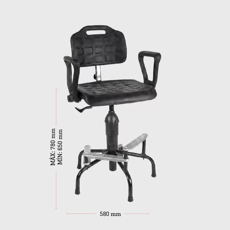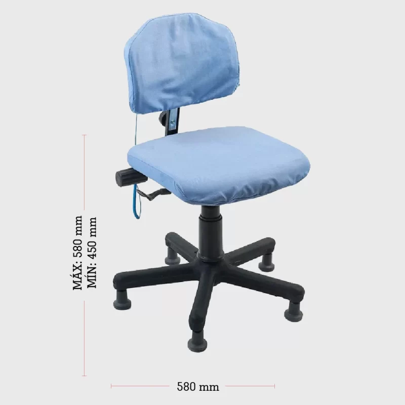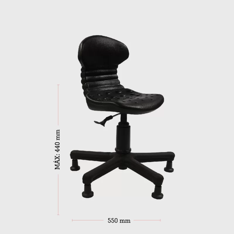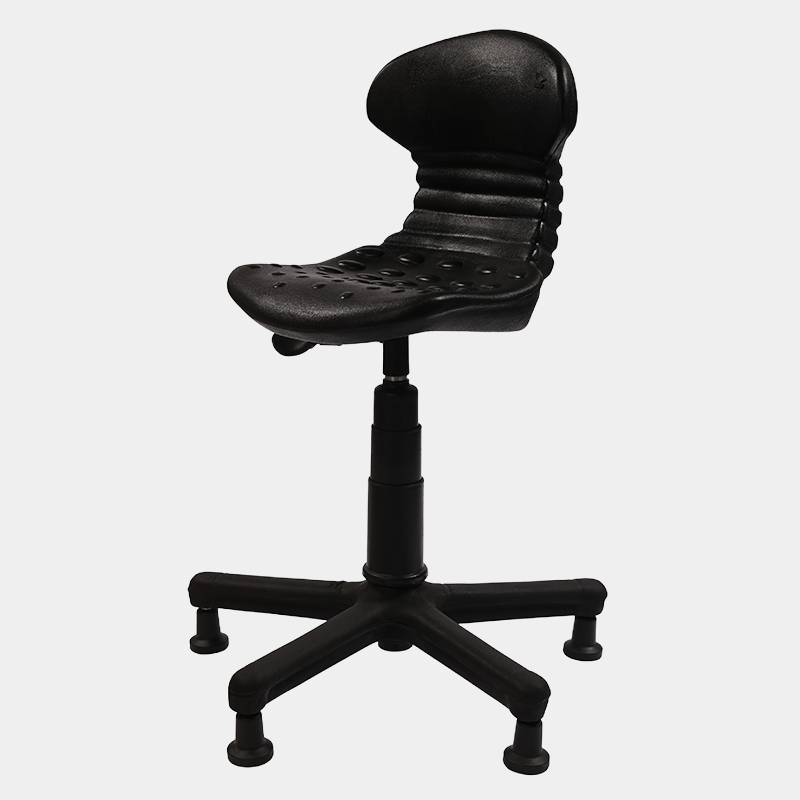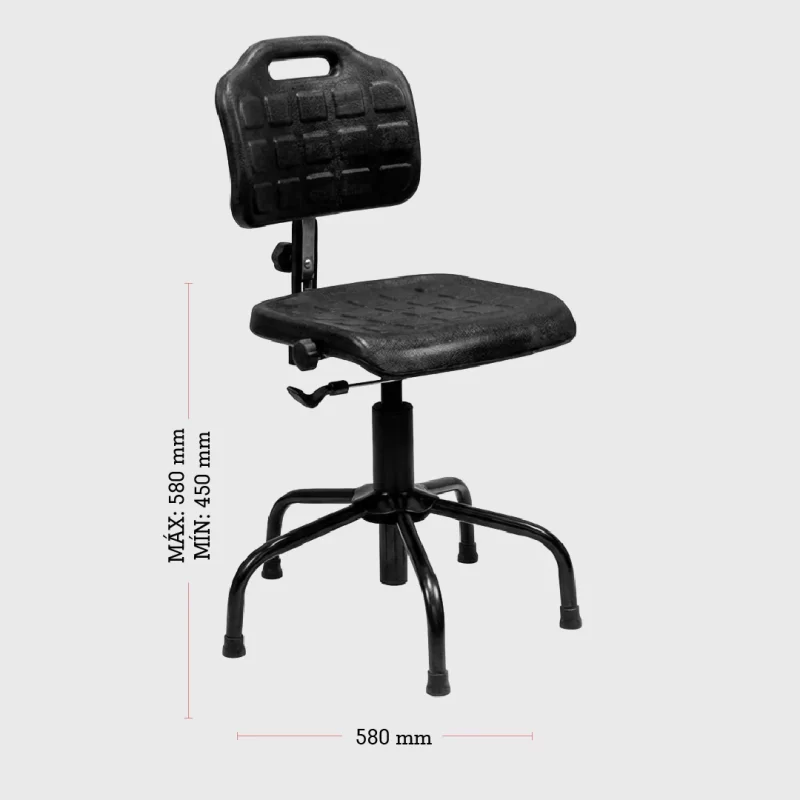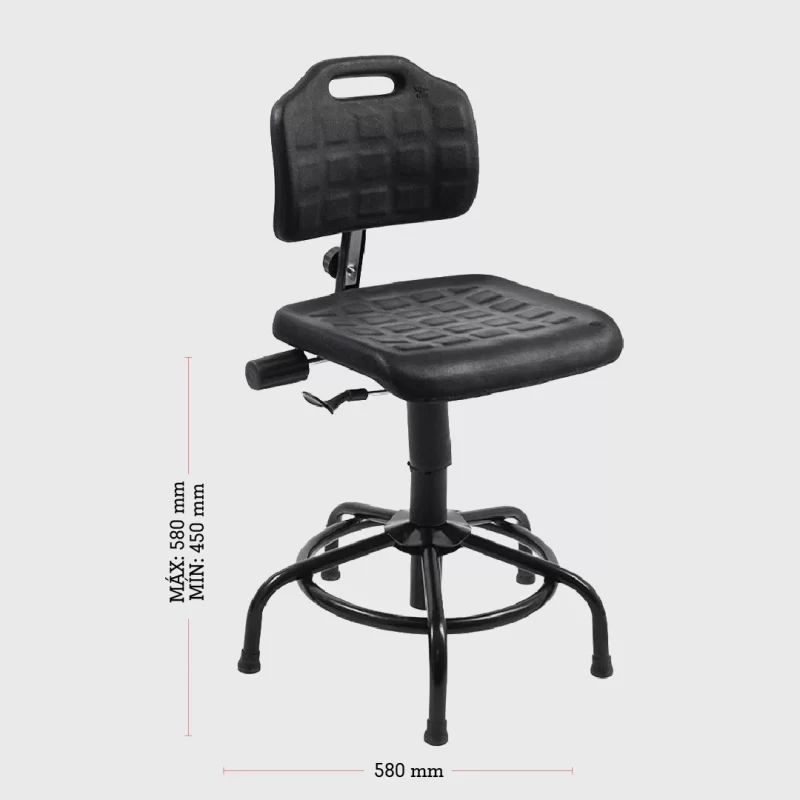 Silla ergonómica de uso industrial. Cuenta con respaldo fijo o reclinable, asiento cuadrado giratorio y regulación neumática de altura.