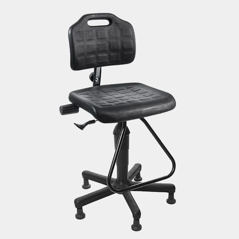 Silla ergonómica de uso industrial. Cuenta asiento cuadrado giratorio. Tiene almohadón incorporado tapizado, con aro apoyapiés, asiento regulable y respaldo oscilante.