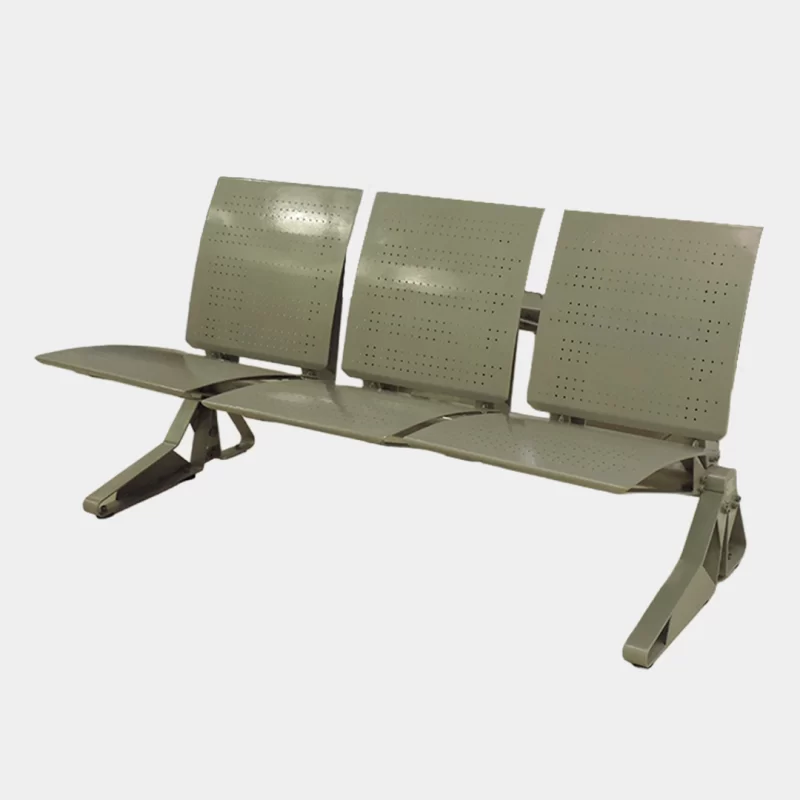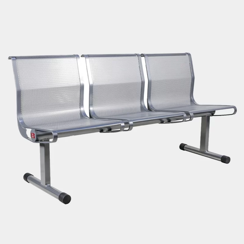 Material de chapa perforada de 1,25mm con refuerzos de chapa de 3 mm en los bordes y planchuelas de 5/16 en la unión de asiento y base, curvado para copiar la silueta del cuerpo.