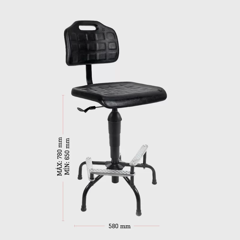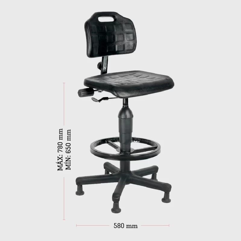 Silla ergonómica de uso industrial. Cuenta con respaldo y asiento cuadrado fijos, ambos con almohadón incorporado. No posee regulación.