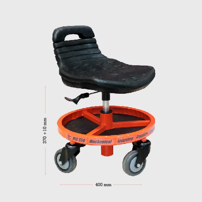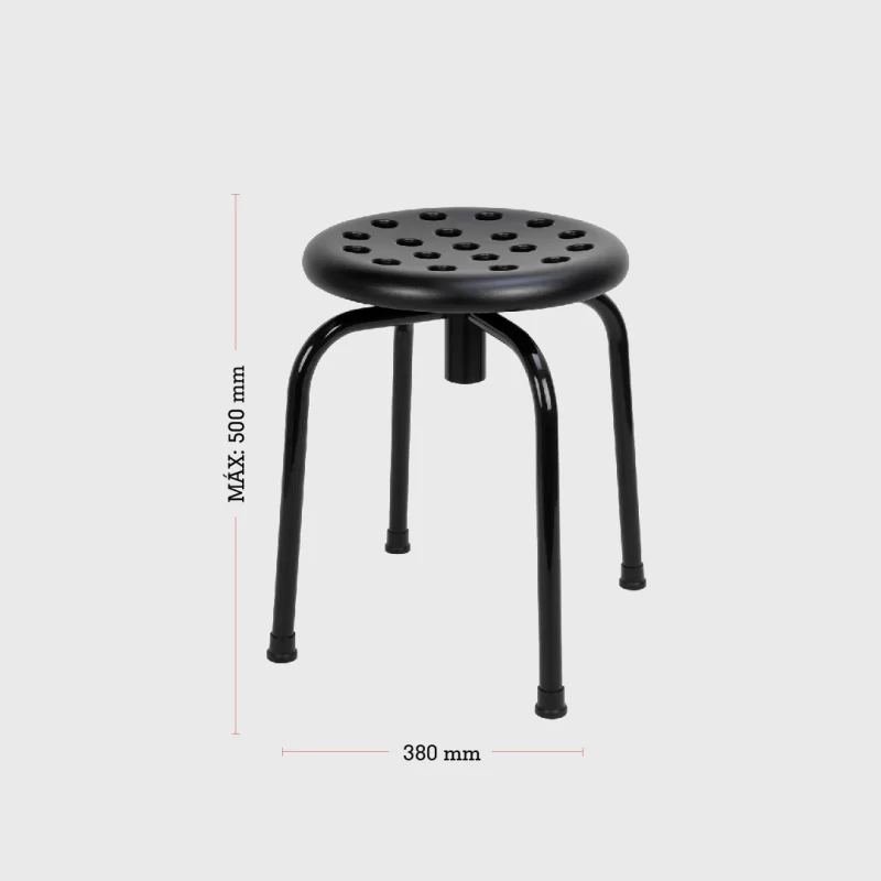 Taburete bajo de uso industrial. Cuenta con respaldo (opcional), asiento redondo giratorio y regulación de altura.