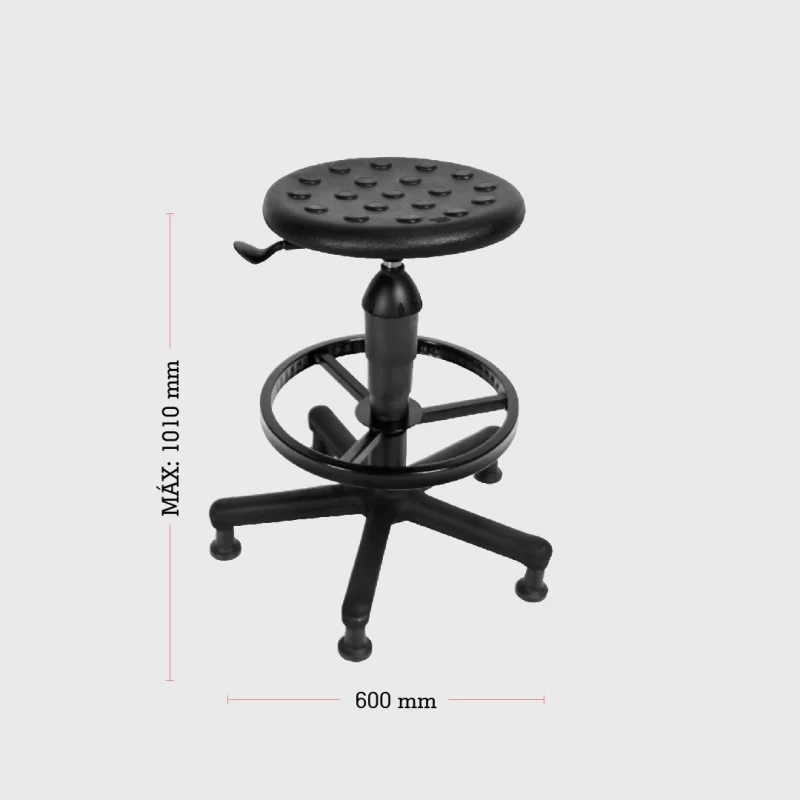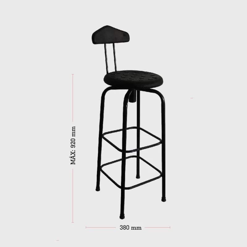 Taburete alto de uso industrial. Cuenta con respaldo (opcional), asiento redondo giratorio y regulación de altura. Además la base puede tener o no apoya pie.