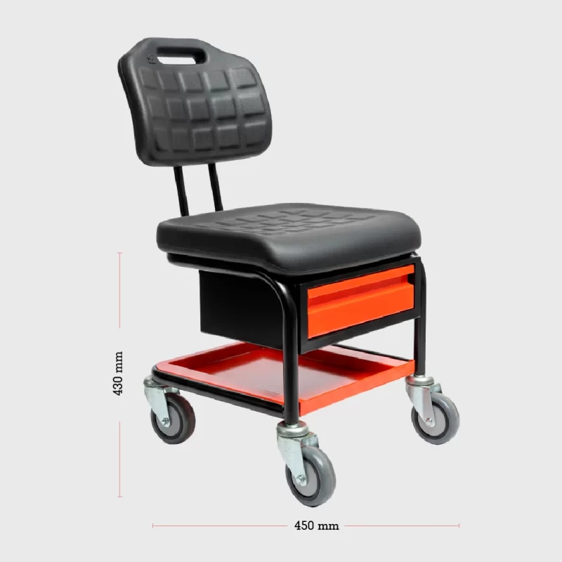 Silla baja deslizante ergonómica de uso industrial. Cuenta con respaldo y asiento cuadrados fijos.