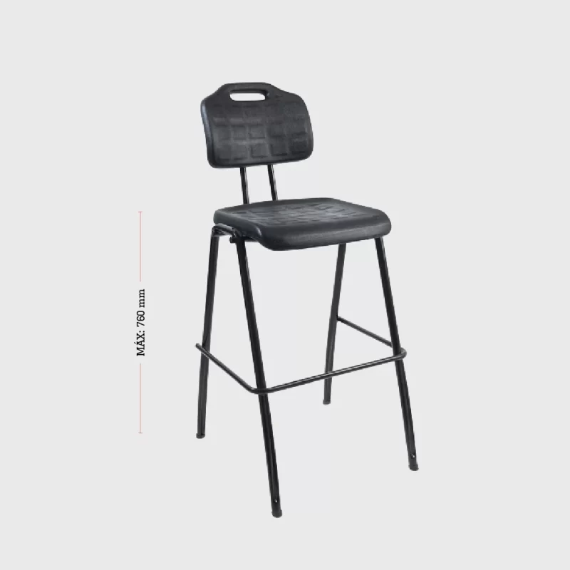 Silla alta ergonómica de uso industrial. Cuenta con respaldo y asiento cuadrados fijos.