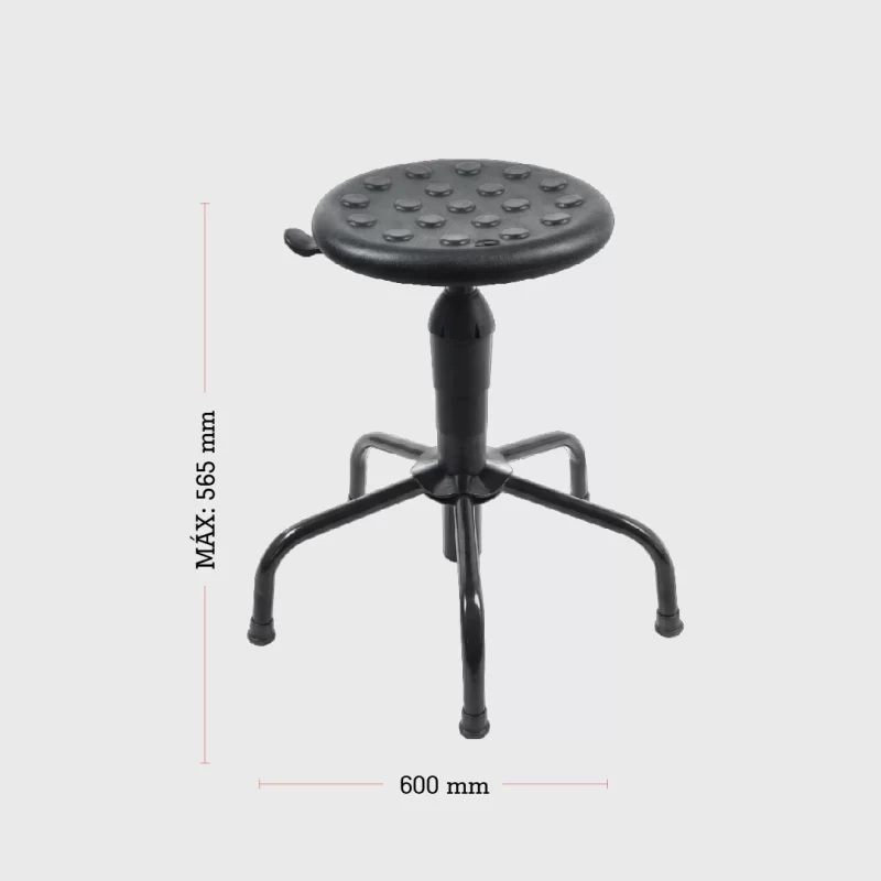 Banco ergonómico bajo de uso industrial. Cuenta con respaldo (opcional) y asiento redondo giratorio.