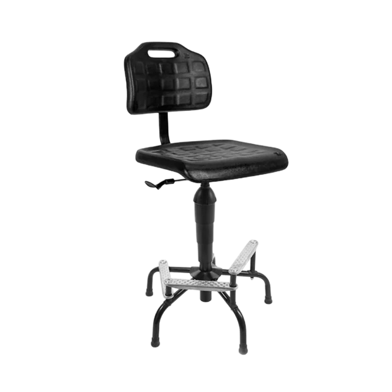 Silla con base industrial y estribos, con regulación de altura y respaldo.